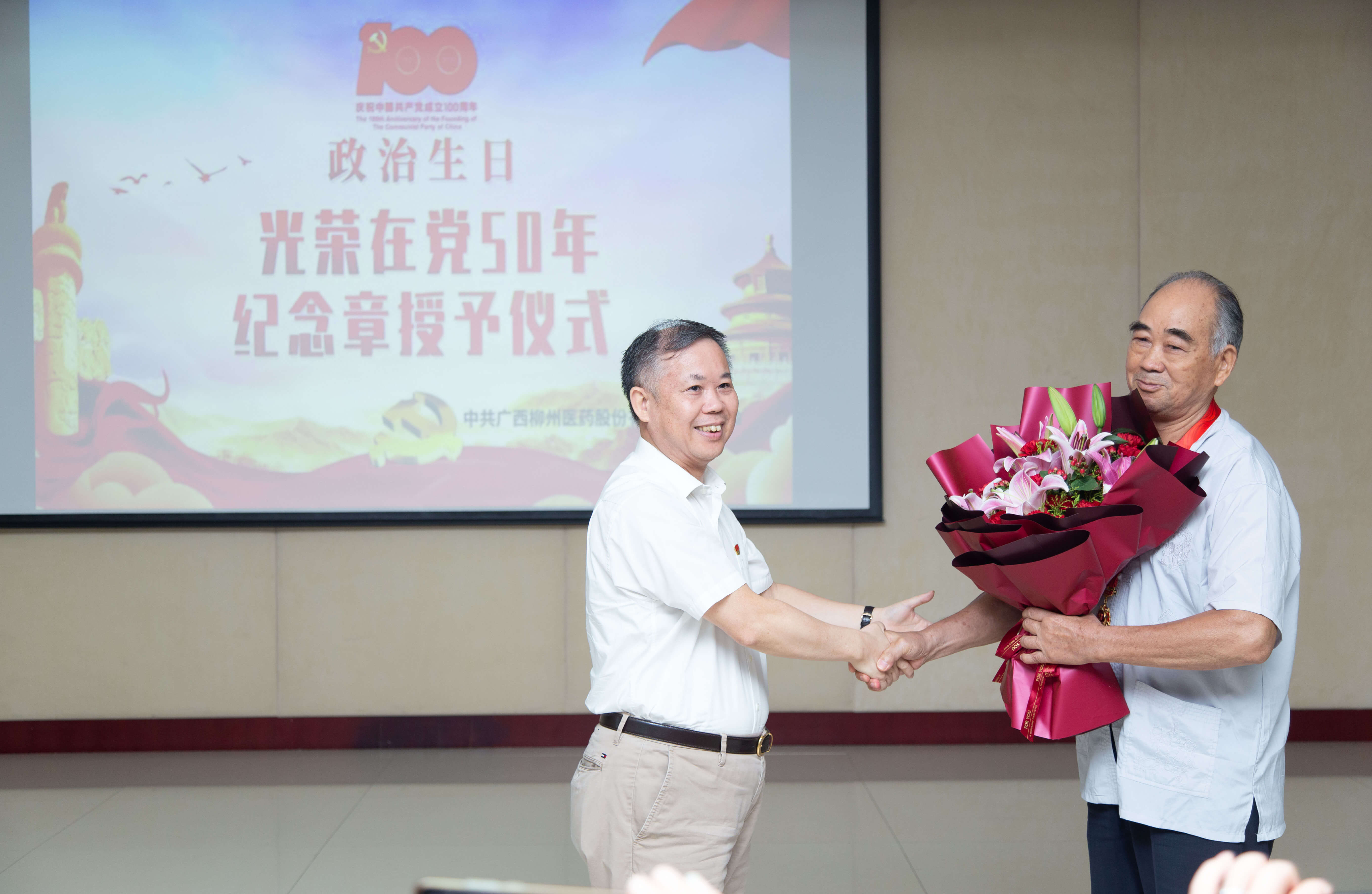 公司党委书记、董事长朱朝阳首先在活动上致辞,他带领广大公司党员回顾党史和公司发展历程,分享公司党员干部的艰苦创业经历,同时指出:建党百年也是柳药股份即将迎来七十周年的重要节点,公司党员干部应在工作上、生活中发挥先锋模范带头作用,传承红色基因,坚定信心跟党走,坚守合规,撸起袖子加油干,依靠勤奋、智慧迎接挑战,实现企业跨越式发展。致辞后,朱朝阳董事长带领公司新进党员宣读入党誓词,全体老党员跟随重温入党誓词,并为公司退休老党员蔡雄昌同志颁发光荣“在党50年”纪念奖章。