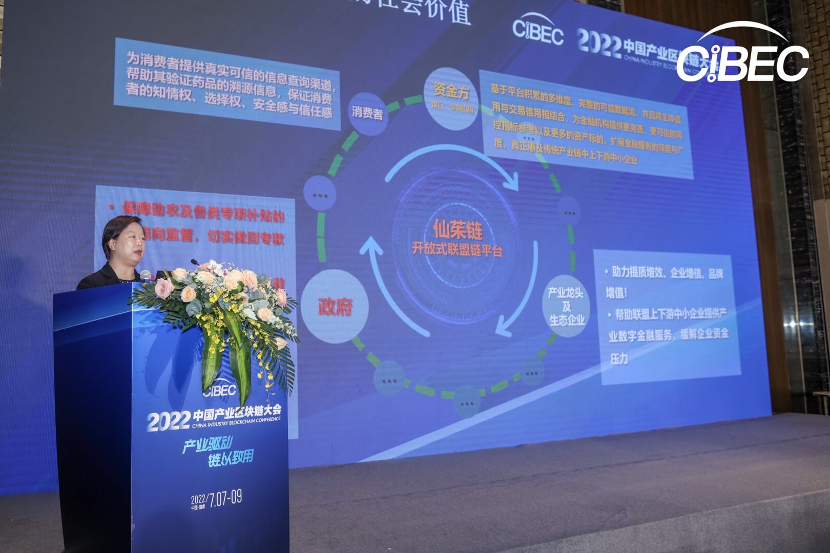 (仙茱中药科技总经理何春花在2022全国供应链与工业区块链高峰论坛以“仙茱链”为主题发表主旨演讲)